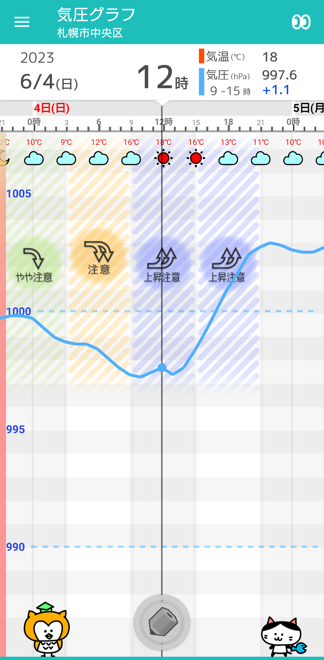低下圧の影響で朝にかけて低下が大きく、その後は上昇に変わって変化も大きくなるため注意してください。