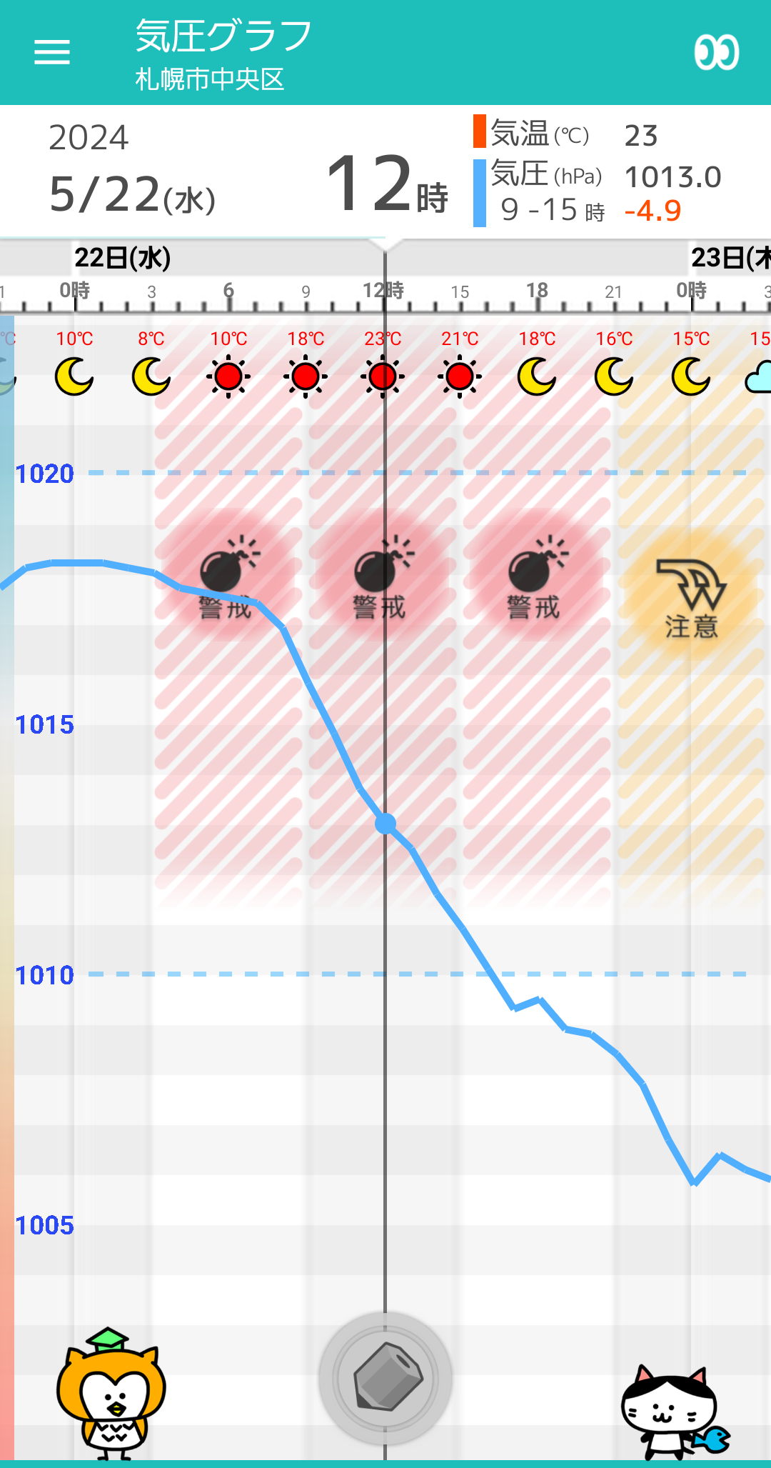 5/22(水)の札幌:高気圧圏内で、だいたい晴れの天気が続くでしょう。 ただ高気圧の中心は離れていくため、気圧は長時間低下が続くようになるでしょう。無理をせずにお過ごしください。 朝は8℃前後まで下がり、やや冷えるでしょう。日中は南西風がやや強まって、22℃くらいまで上がる予想です。