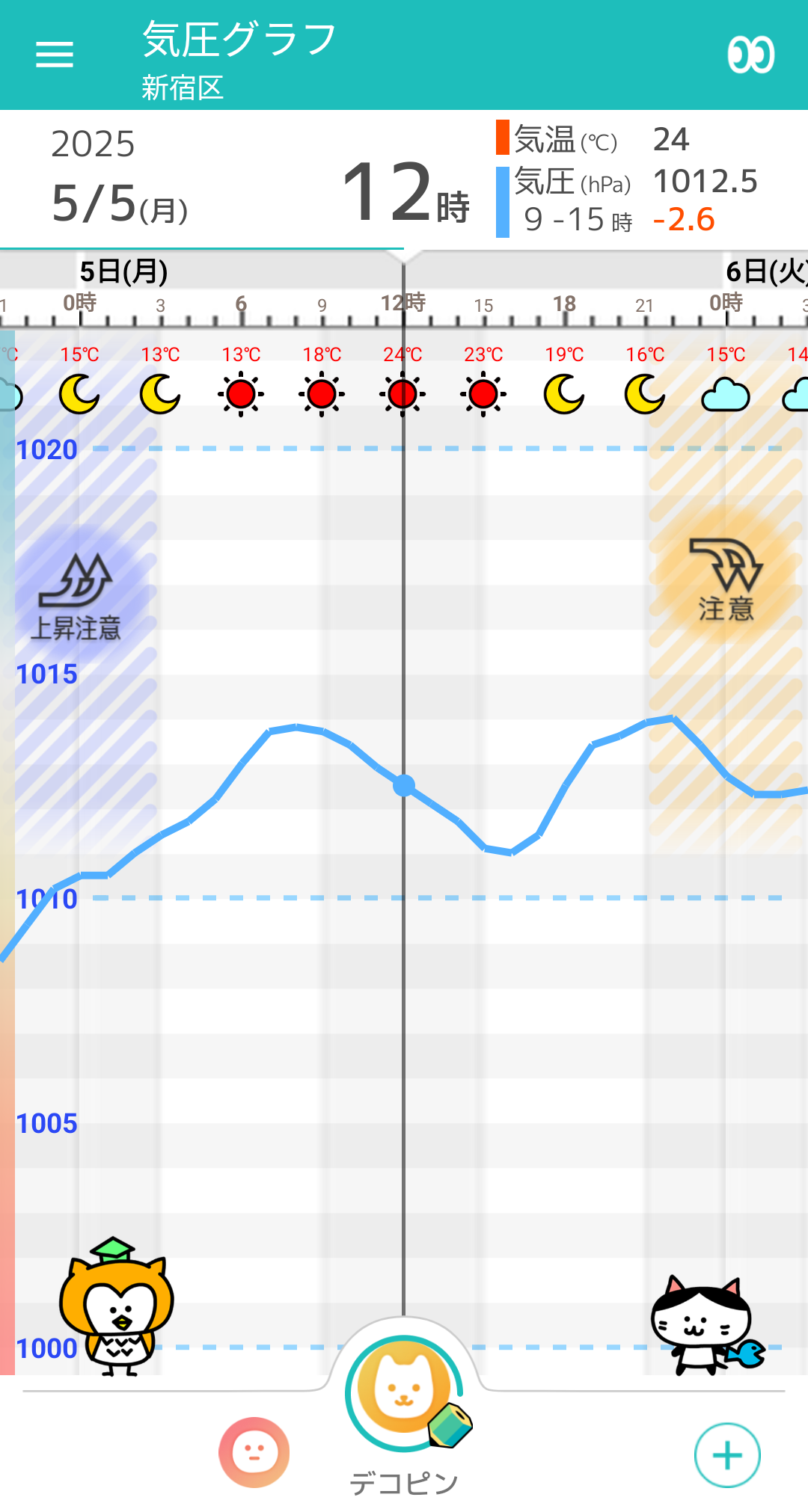 気圧も夕方頃まで安定して推移する予想です。ただ、夜遅くなりますと低下が始まりますので、お早めにお休みください。 最高気温は24℃予想。強い日差しの下では、少し汗ばむ陽気となりそうです。