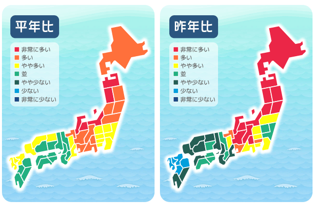 総飛散量 平年と比べると特に北日本で多い