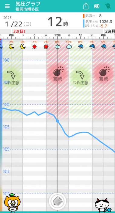 1/22(日) 福岡の天気頭痛予報 晴れるが次第に雲が広がり夕方から雨 気圧が大きく低下 無理せず安静に