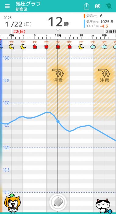 1/22(日) 東京の天気頭痛予報 晴れるが次第に雲に覆われる 気圧が低下 体調の悪化に注意