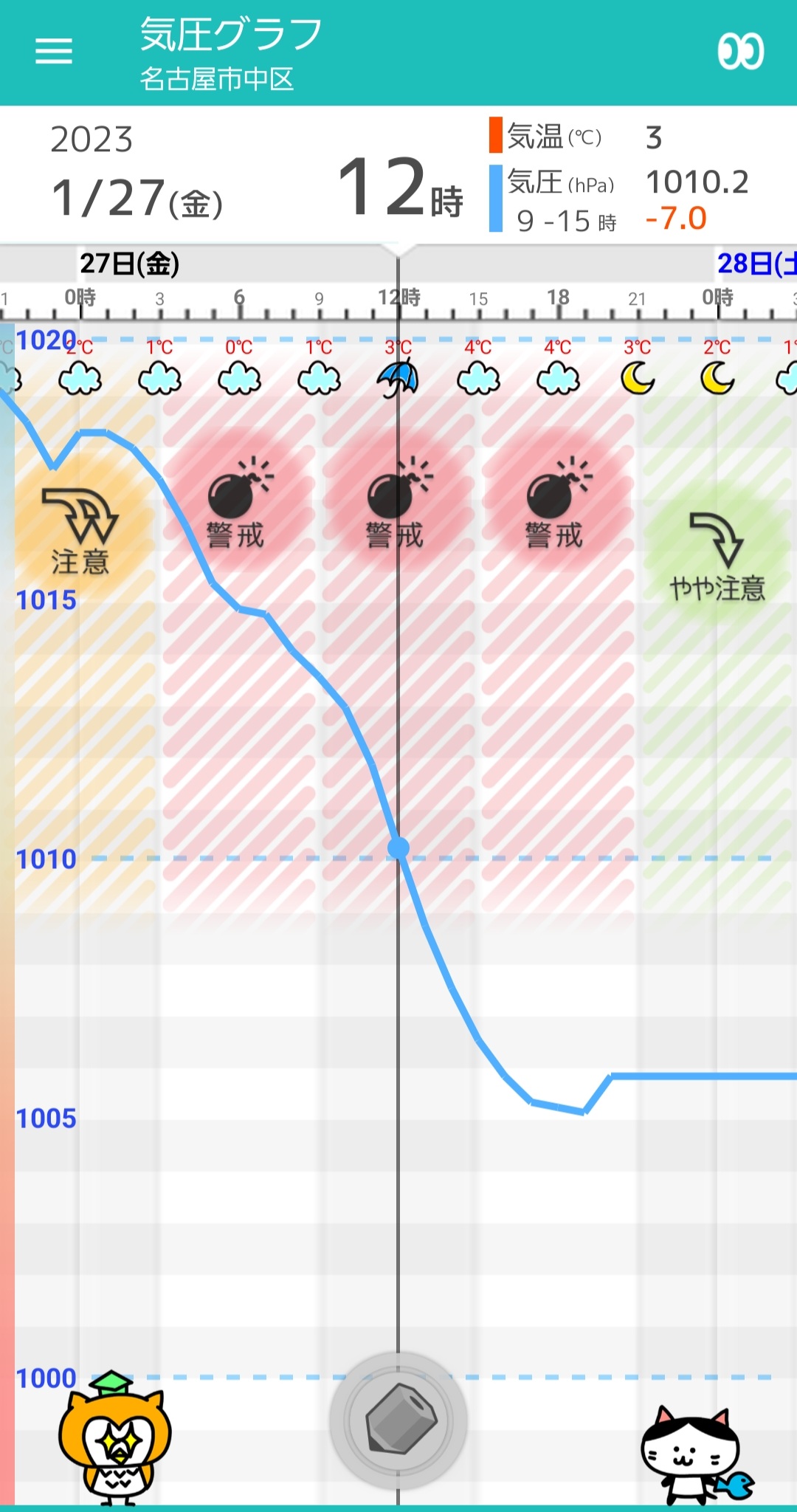 1/27(金) 名古屋の天気頭痛予報 昼前後に雪か雨。気圧は右肩下がり!