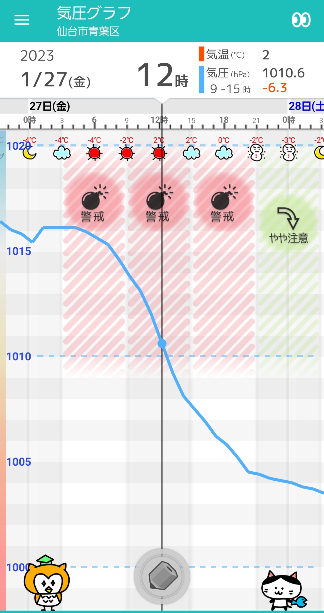 1/27(金) 仙台の天気頭痛予報 寒さ続き、夜には雪。気圧は急激に低下!