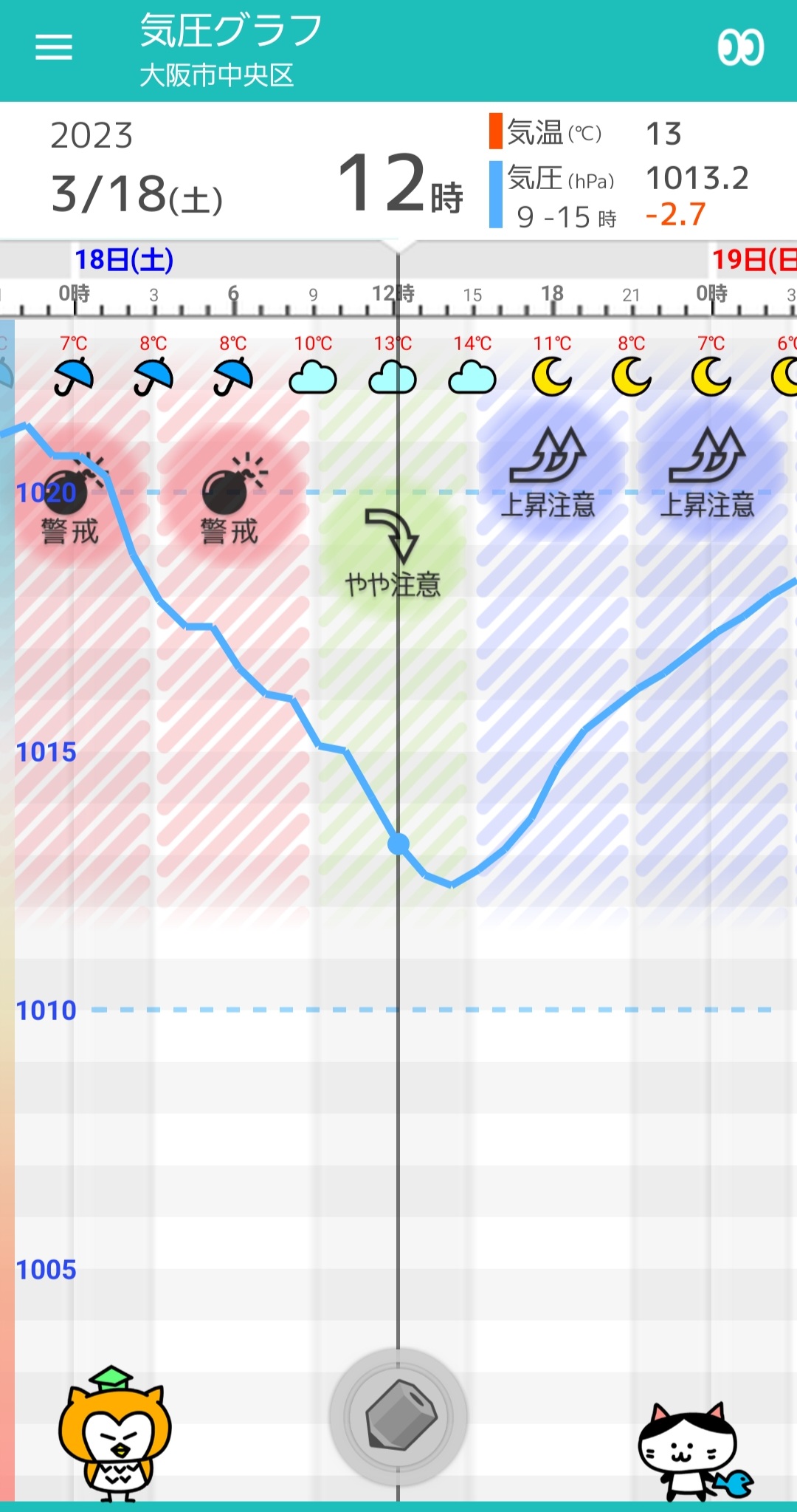 3/18(土) 大阪の天気頭痛予報 日中は次第に雨が止む。気圧の変化大きい一日!