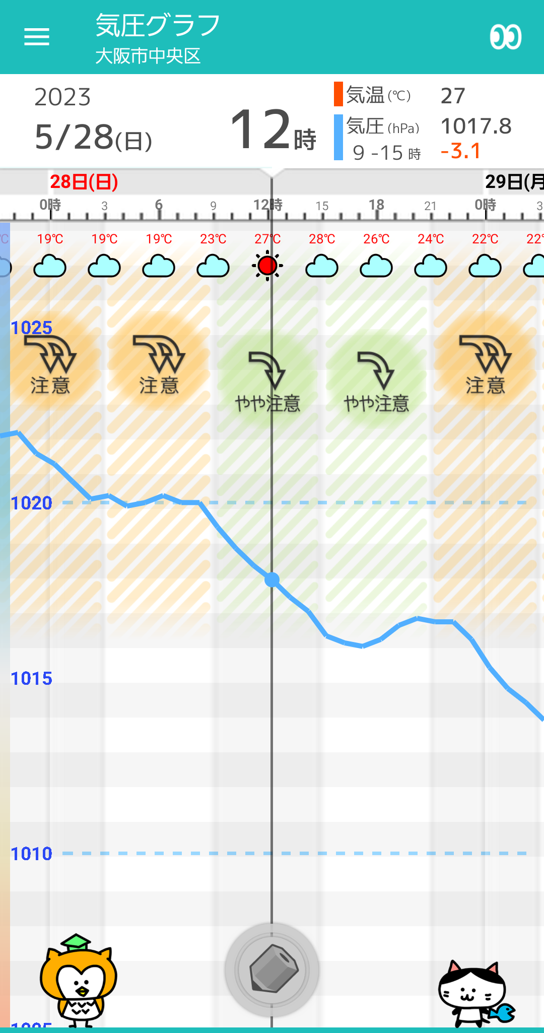 5/28(日) 大阪の天気頭痛予報 晴れ間あって汗ばむ陽気。気圧低下に注意