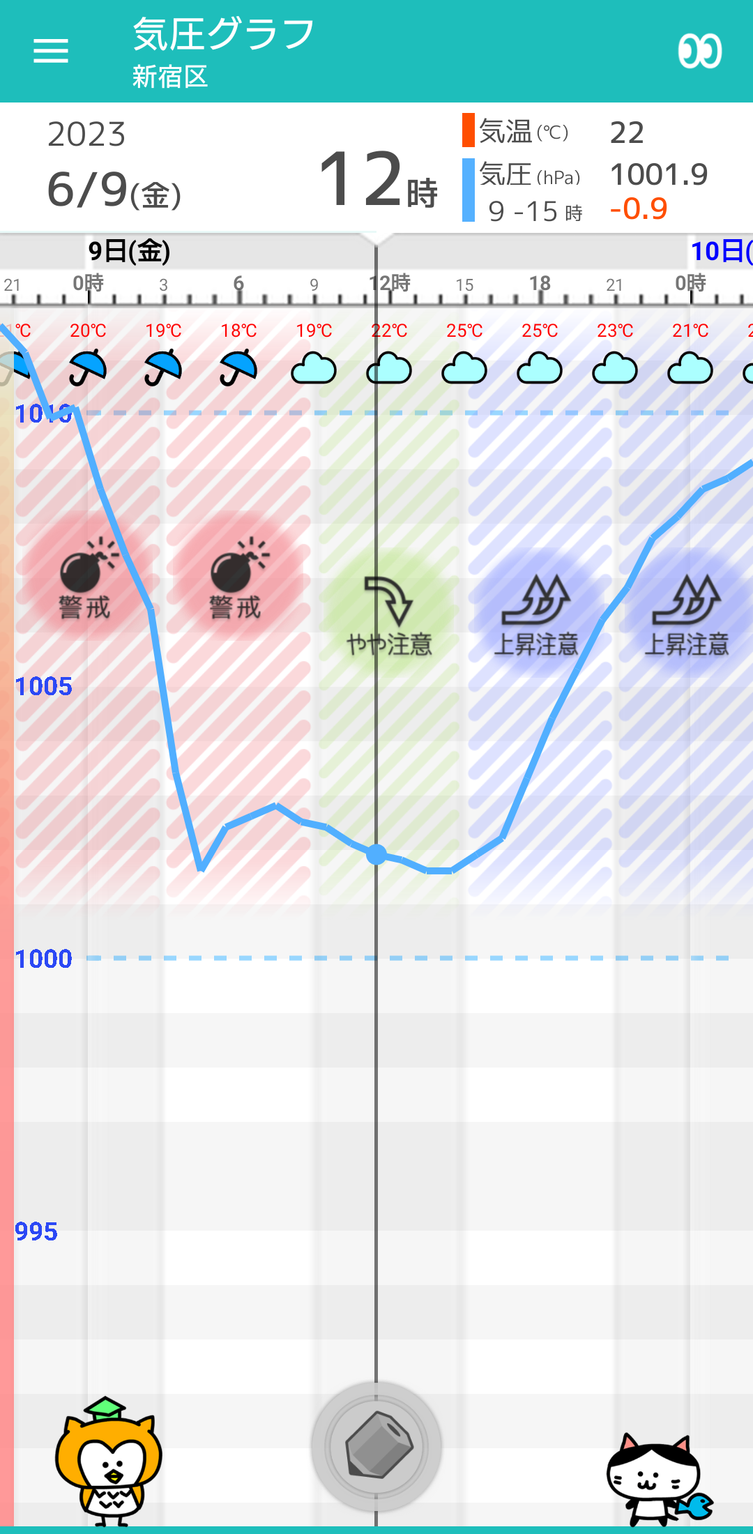 気圧が朝にかけて急激に低下し、夕方以降は上昇に変わって大きく上昇していくでしょう。気圧変化の大きな1日になりますので注意してください。
