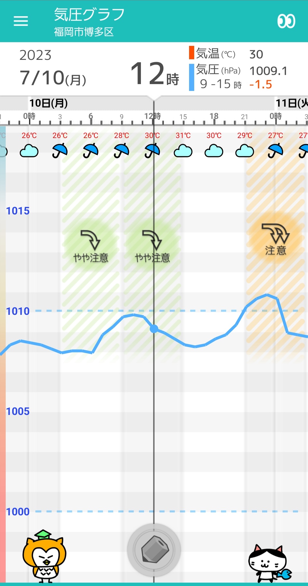 7/10(月) 福岡の天気頭痛予報 午前に激しい雷雨の恐れ。小刻みな気圧変化に注意!