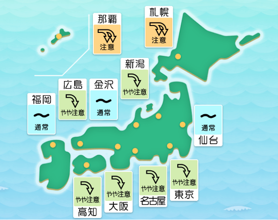 台風7号は日本海を北上し北海道の北を通過して温帯低気圧に変わる見込みです。湿った空気が引き続き流れ込む影響で、関東など一部をのぞき雲が広がりやすく、西日本は雨の降る所が多いでしょう。