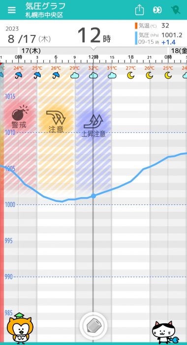 8/17(木) 札幌の天気頭痛予報 雲が広がり朝方まで雨 暑さが戻る 気圧変化が大きくなるべく安静に