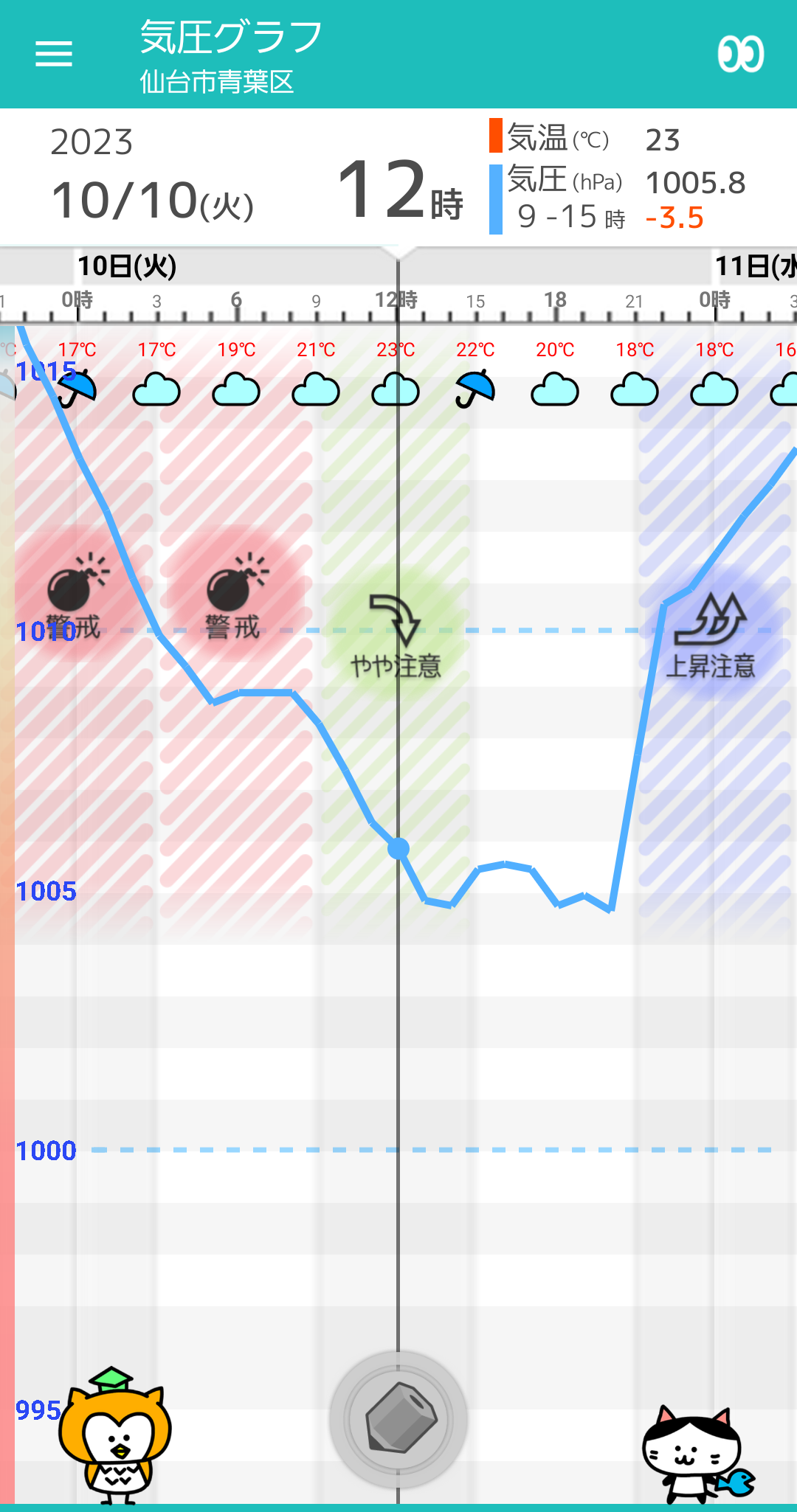 10/10(火) 仙台の天気頭痛予報 朝までと昼過ぎ以降に雨。気圧は低下のち上昇!