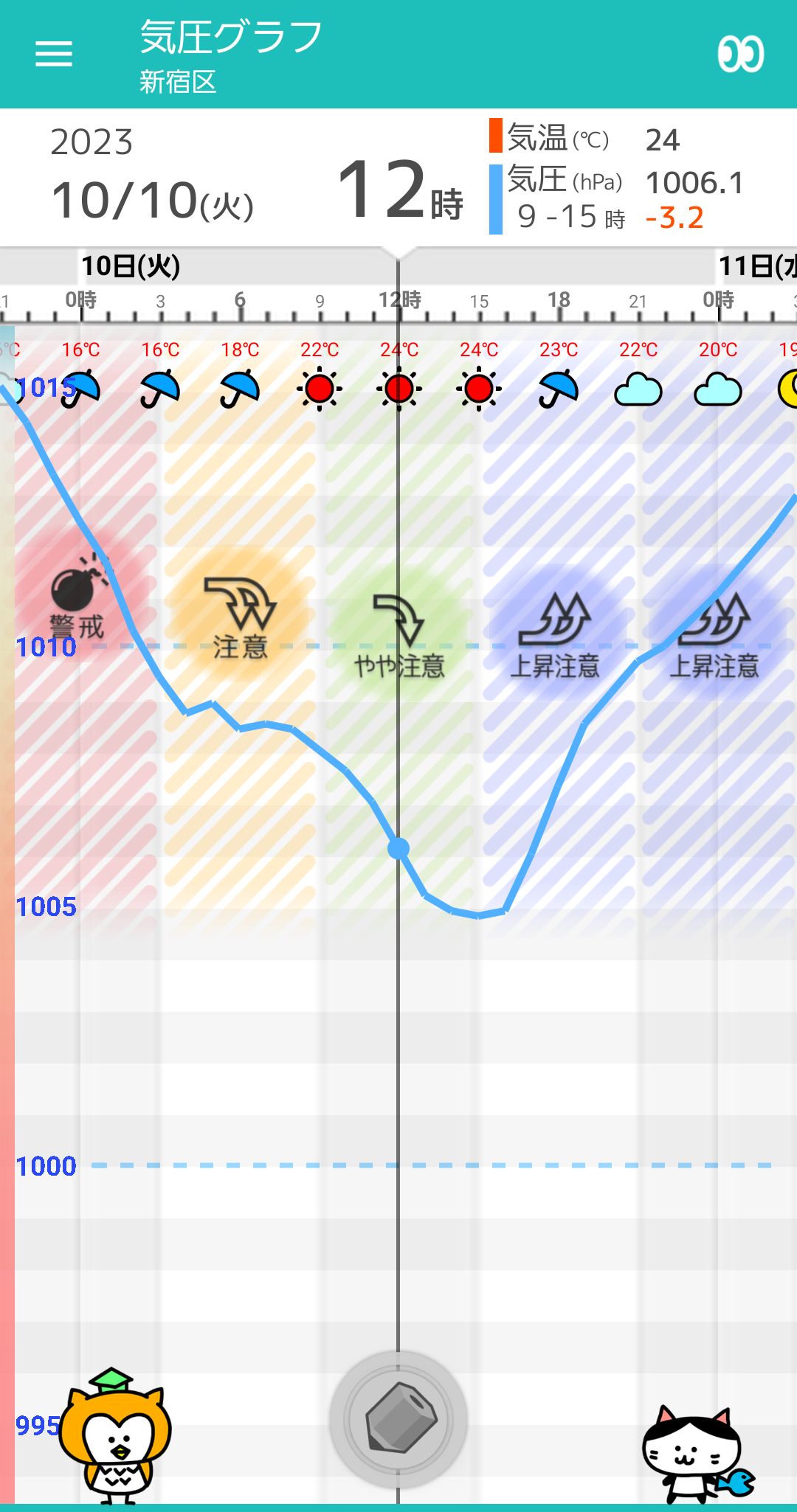 気圧は昼過ぎまで大きく低下し、夕方以降は大きく上昇。変動の大きな一日となりますので、無理をせずにお過ごしください。