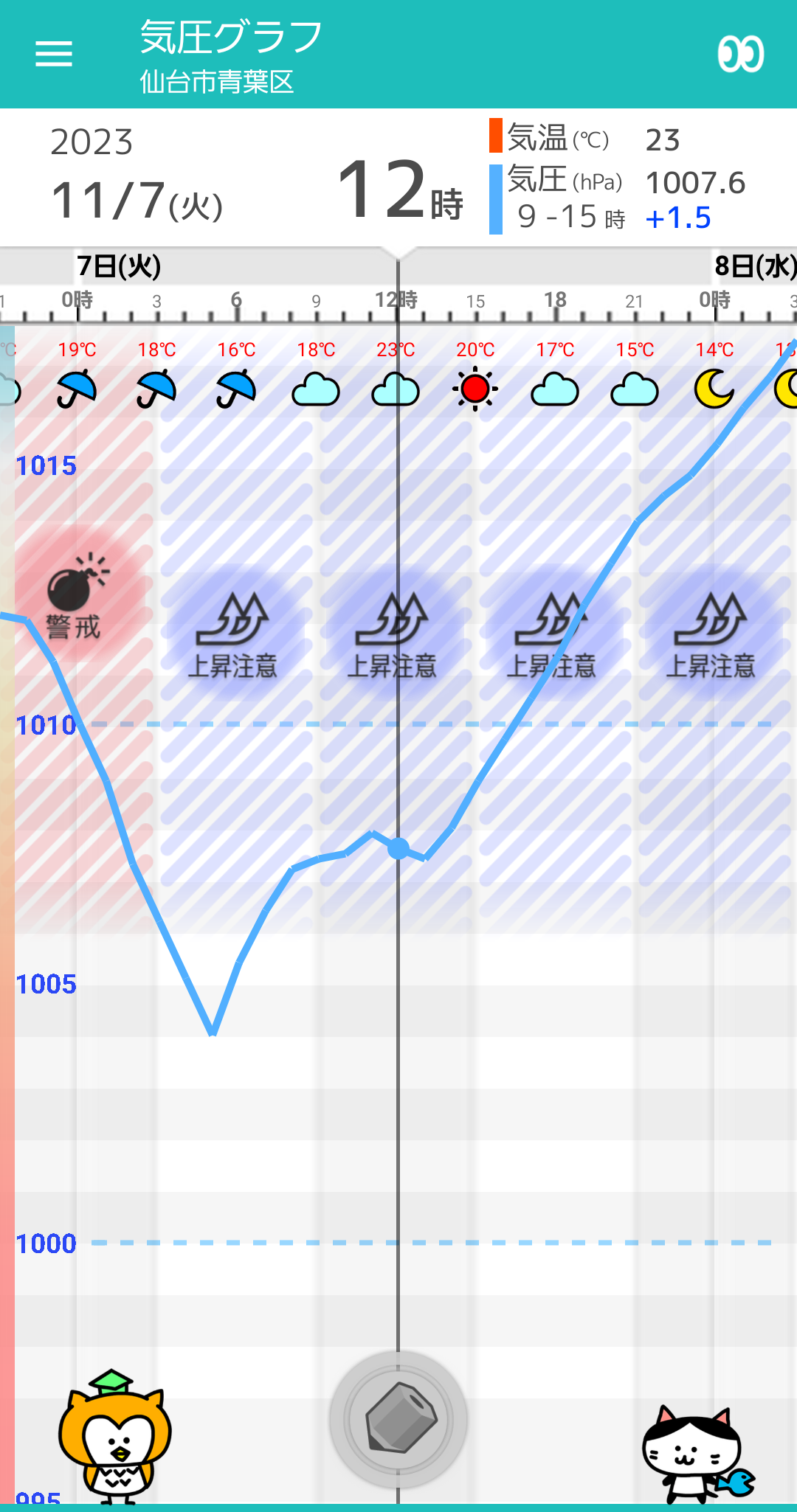 11/7(火) 仙台の天気頭痛予報 朝は雨風強まる!気圧は上昇が続く