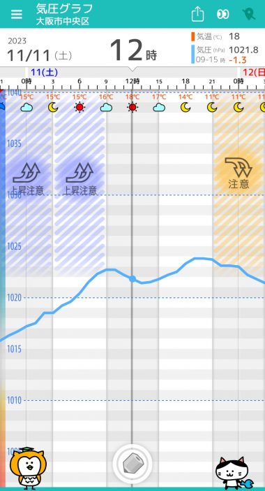 11/11(土) 大阪の天気頭痛予報 晴れ間は出るが雲が多め 夜は気圧低下に注意
