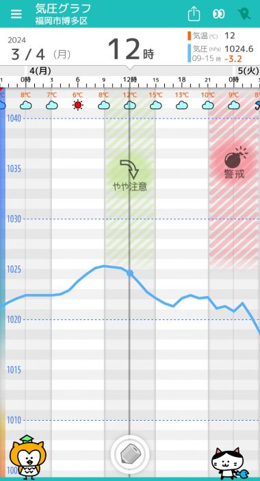 3/4(月) 福岡の天気頭痛予報 雲が広がり夜遅くに雨も 夜から気圧低下 5日は更に大きく低下 体調悪化に注意