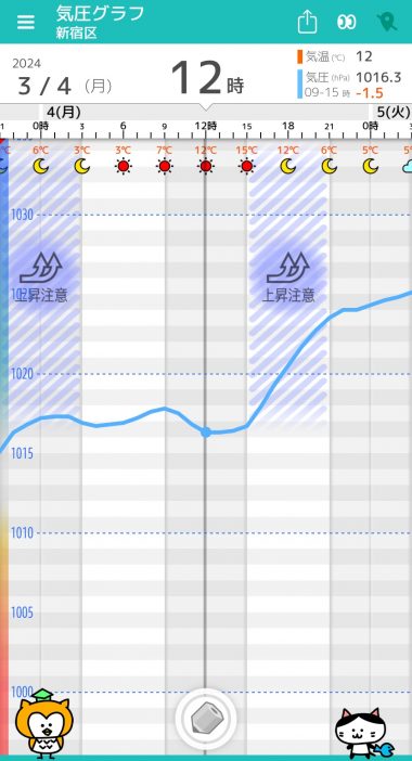 気圧は昼過ぎから夜にかけて大きく上昇しますので、気圧の上昇に敏感な人は体調の変化に十分注意してください。