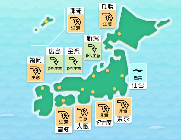 最高気温は20℃前後の所が多く、比較的過ごしやすい陽気でしょう。