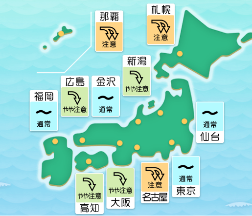 気圧は日中の低下に注意が必要な所がありますが、安定している所もありそうです。