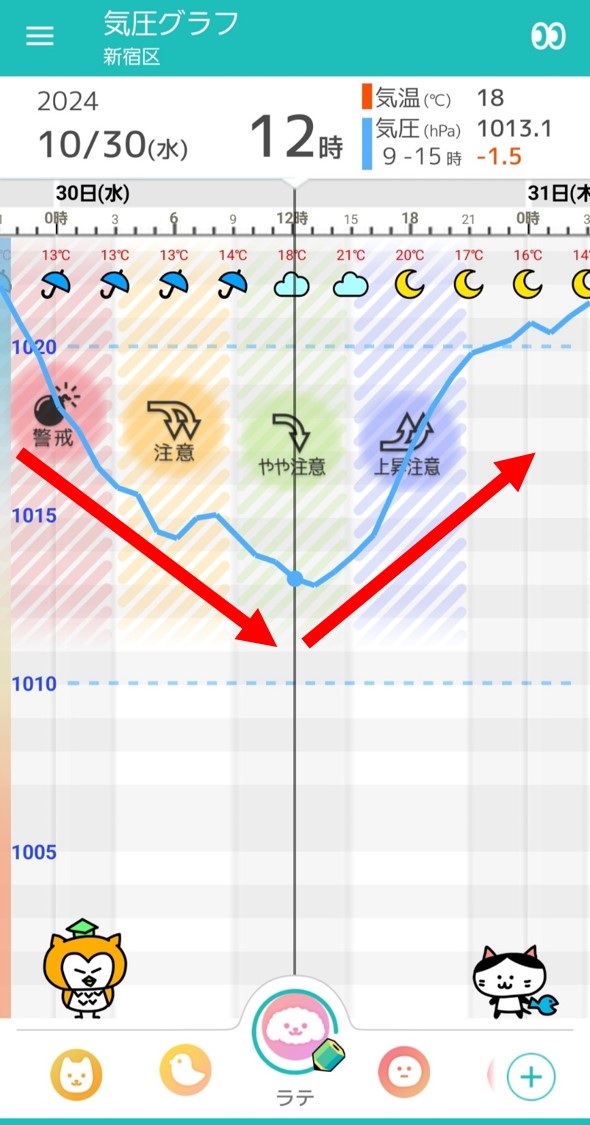 10/30(水) 東京の天気頭痛予報 朝は雨で大きく気圧低下!午後は気圧急上昇へ。