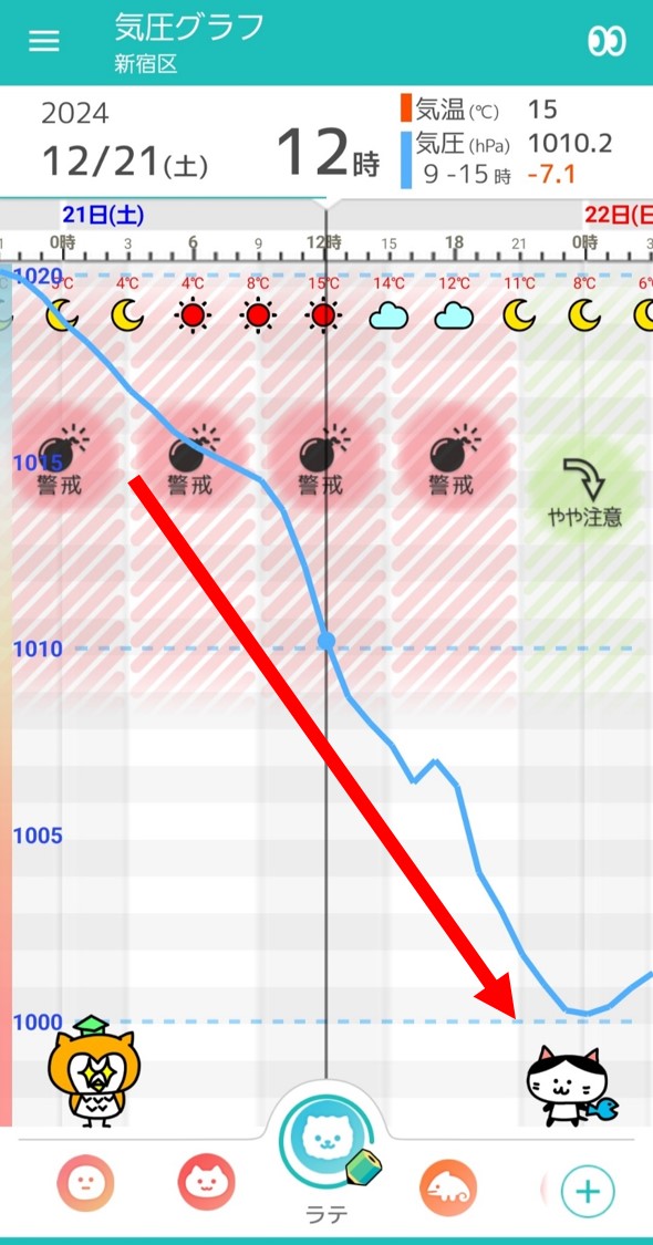 12/21(土) 東京の天気頭痛予報 気温は上昇も気圧は急激な低下!体調管理にご注意を。
