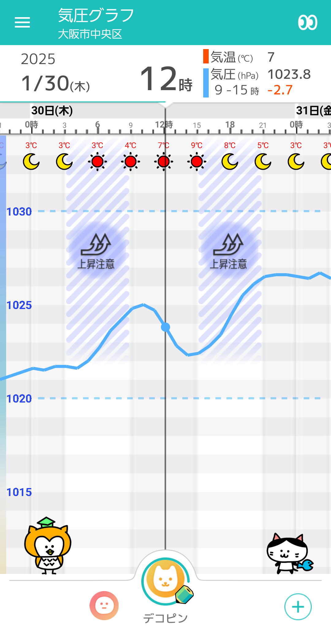 気圧は午前と午後にそれぞれ上昇するタイミングがありますので、体調の変化にお気を付けください。