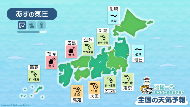 気圧は北日本や東日本では安定傾向で推移する見込みです。西日本では低下が大きくなりそうですので、体調の変化にお気を付けください。