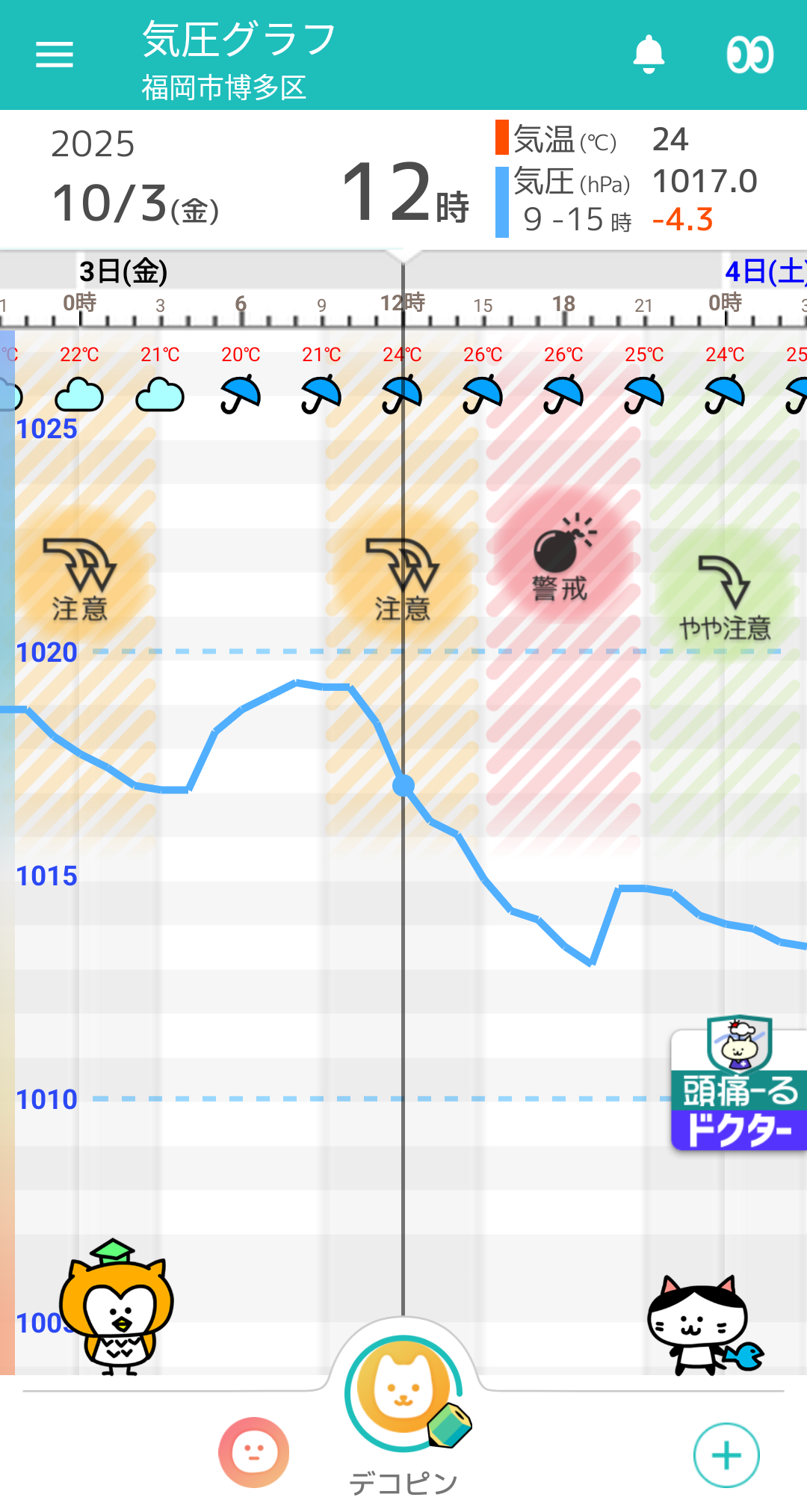 気圧は一日低下傾向が続き、特に午後は大きく下がりますので無理をせずにお過ごしください。