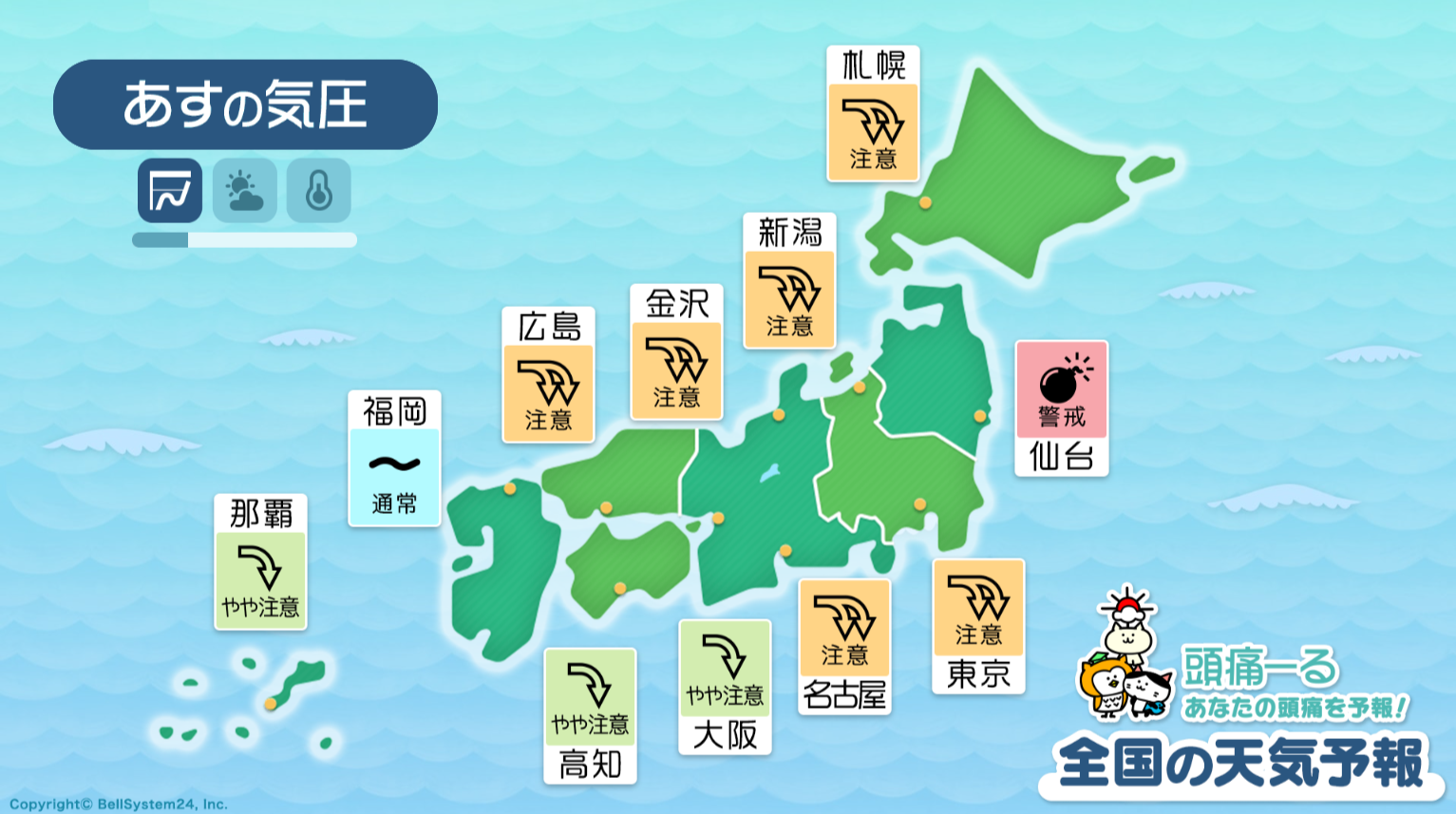 気圧は北日本から東日本にかけて低下傾向が続き、注意や警戒になる所が多いでしょう。その他でもやや注意が必要な時間が続きますので注意してください。