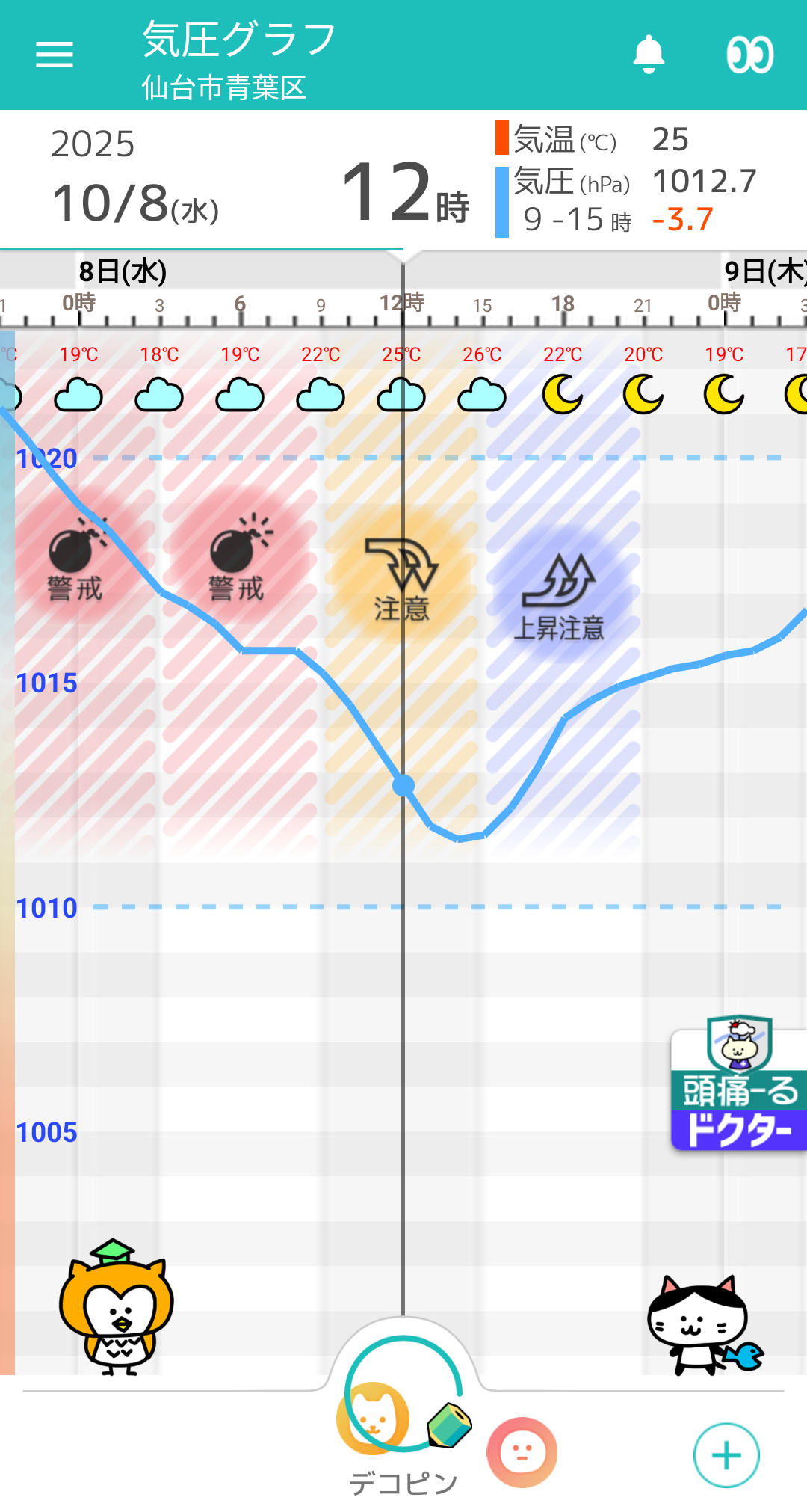 10/8(水) 仙台の天気頭痛予報 雲が多く、朝まで雨の可能性。午前は気圧が急降下!