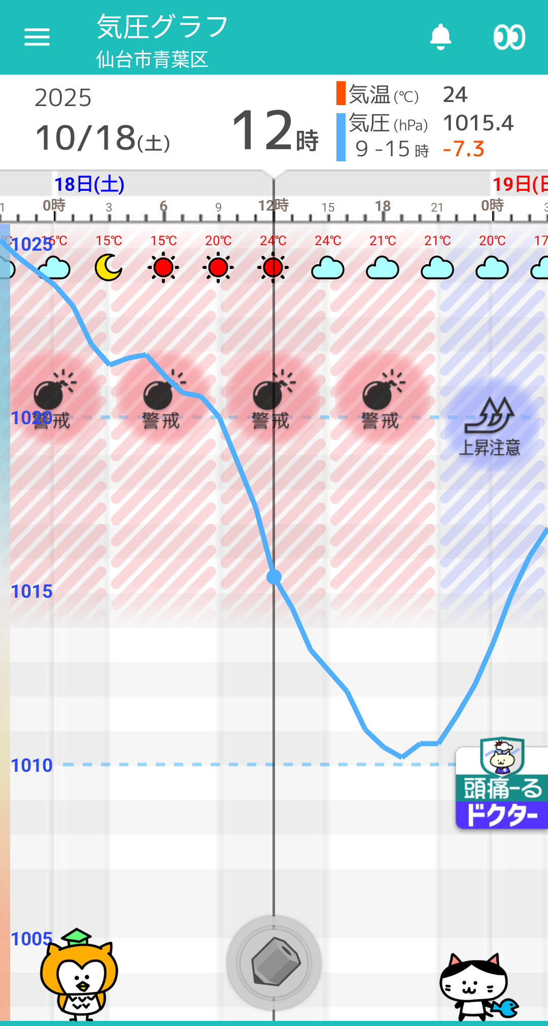10/18(土) 仙台の天気頭痛予報 午前中は晴れ。午後は曇り空。気圧低下に超警戒!