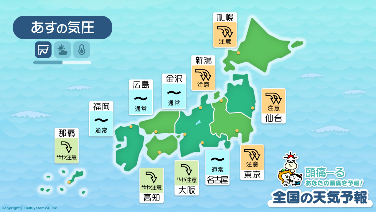10/19(日)の天気頭痛予報: 低気圧と前線が通過していき、前線は次第に本州南岸に停滞するようになるでしょう。