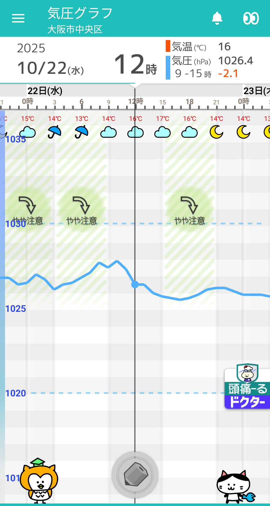 気圧の大きな低下はありませんが、やや低下する時間がありますので、体調の変化にお気を付けください。