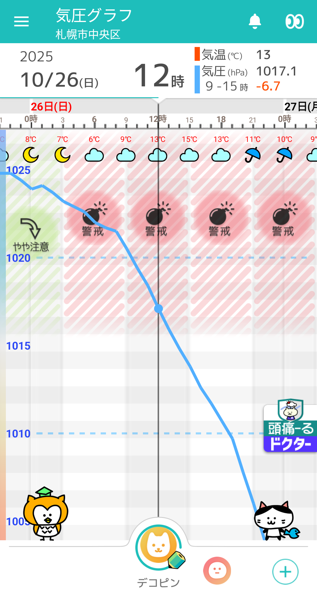 10/26(日) 札幌の天気頭痛予報 夜には雨。気圧は急降下が続く。超警戒を!