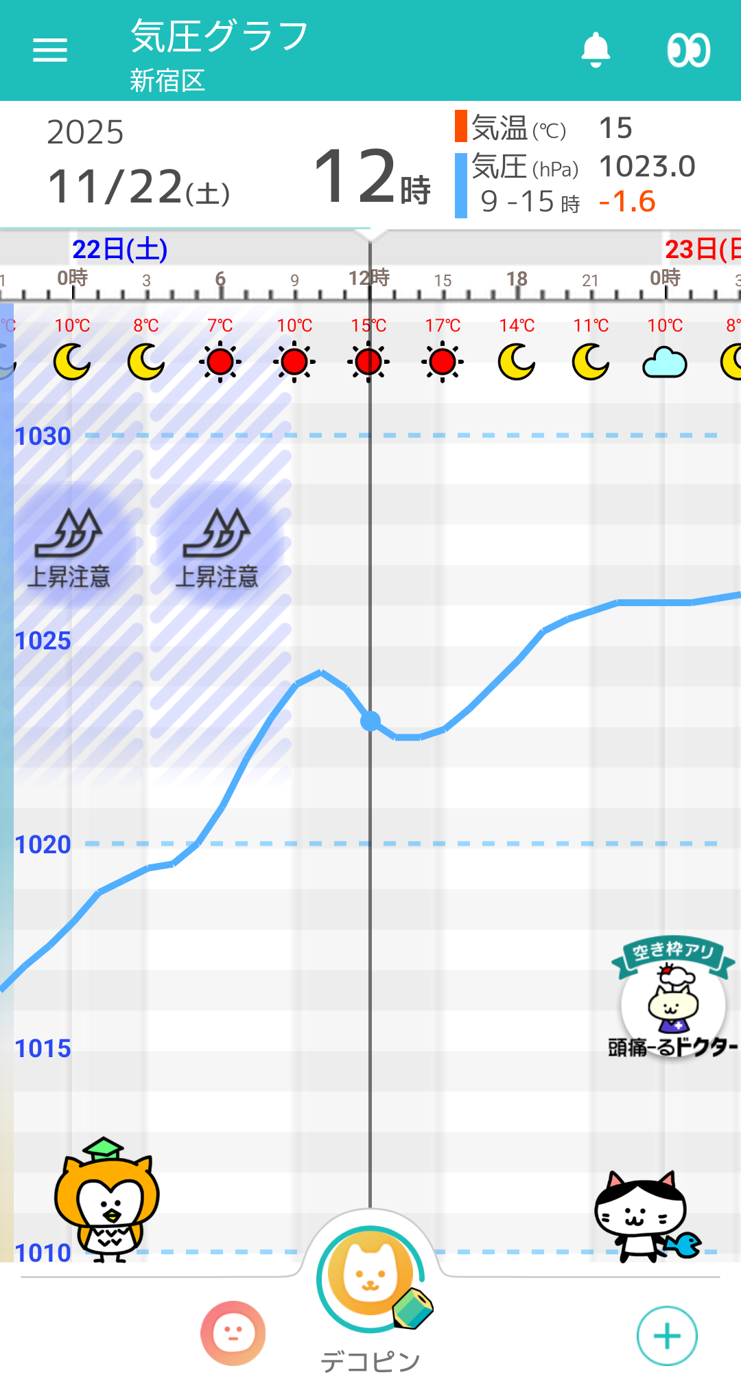 11/22(土) 東京の天気頭痛予報 穏やかな秋晴れ。気圧は次第に安定傾向