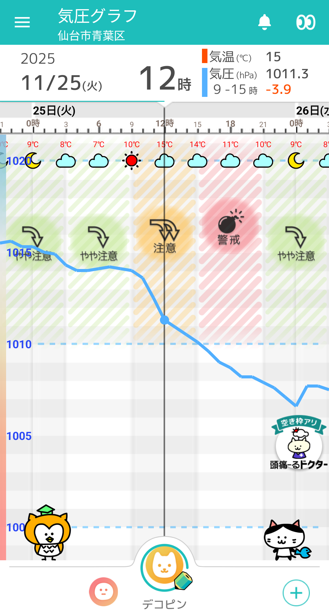 11/25(火) 仙台の天気頭痛予報 雲の多い一日。気圧が大きく低下!