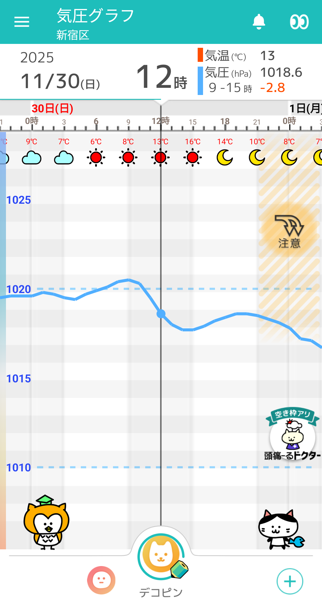 気圧は夕方頃にかけて安定傾向で推移していきそうです。夜になると低下しますので、お早めにお休みください。