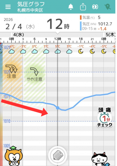 毎日の天気頭痛予報 頭痛ーるTOP 毎日の天気頭痛予報2/4(水) 札幌の天気頭痛予報 気温上昇、雪解け進む 日中は比較的気圧安定 2/4(水) 札幌の天気頭痛予報 気温上昇、雪解け進む 日中は比較的気圧安定 2/4(水)の札幌: 明け方までは雪で吹雪く所もあるでしょう。日中は曇りとなりそうです。 気温は朝・日中ともに3日より高くなり、朝は氷点下3℃くらいの予想、日中は5℃まで上がる見込みです。雪解けが進みますので、雪崩や屋根からの落雪にご注意ください。 気圧は3日から4日朝にかけて下降が続きます。日中は比較的安定するでしょう。 ◆他の地域の天気頭痛予報はこちら 全国 東京 福岡