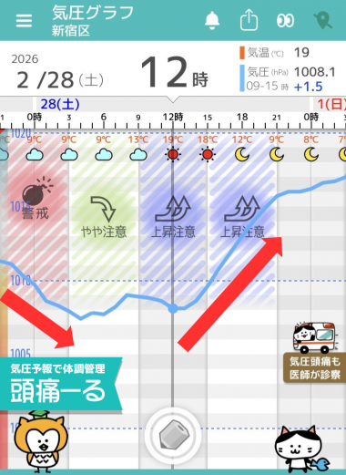 毎日の天気頭痛予報 頭痛ーるTOP 毎日の天気頭痛予報2/28(土) 東京の天気頭痛予報 日中は晴れて4月の暖かさ 午後は気圧上昇 2/28(土) 東京の天気頭痛予報 日中は晴れて4月の暖かさ 午後は気圧上昇 2/28(土)の東京: 朝は雲が広がりますが、次第に晴れてくる見込みです。天気の崩れは無いでしょう。ただ北風がやや強く吹きそうです。 朝の気温は27日より2℃高い9℃、日中は20℃くらいまで上がる見込みです。4月中旬から下旬並みの気温となりそうです。 朝までは気圧が低下傾向です。午後は一転して上昇注意となっていますので、体調管理に気をつけてお過ごしください。 ◆他の地域の天気頭痛予報はこちら 全国 札幌
